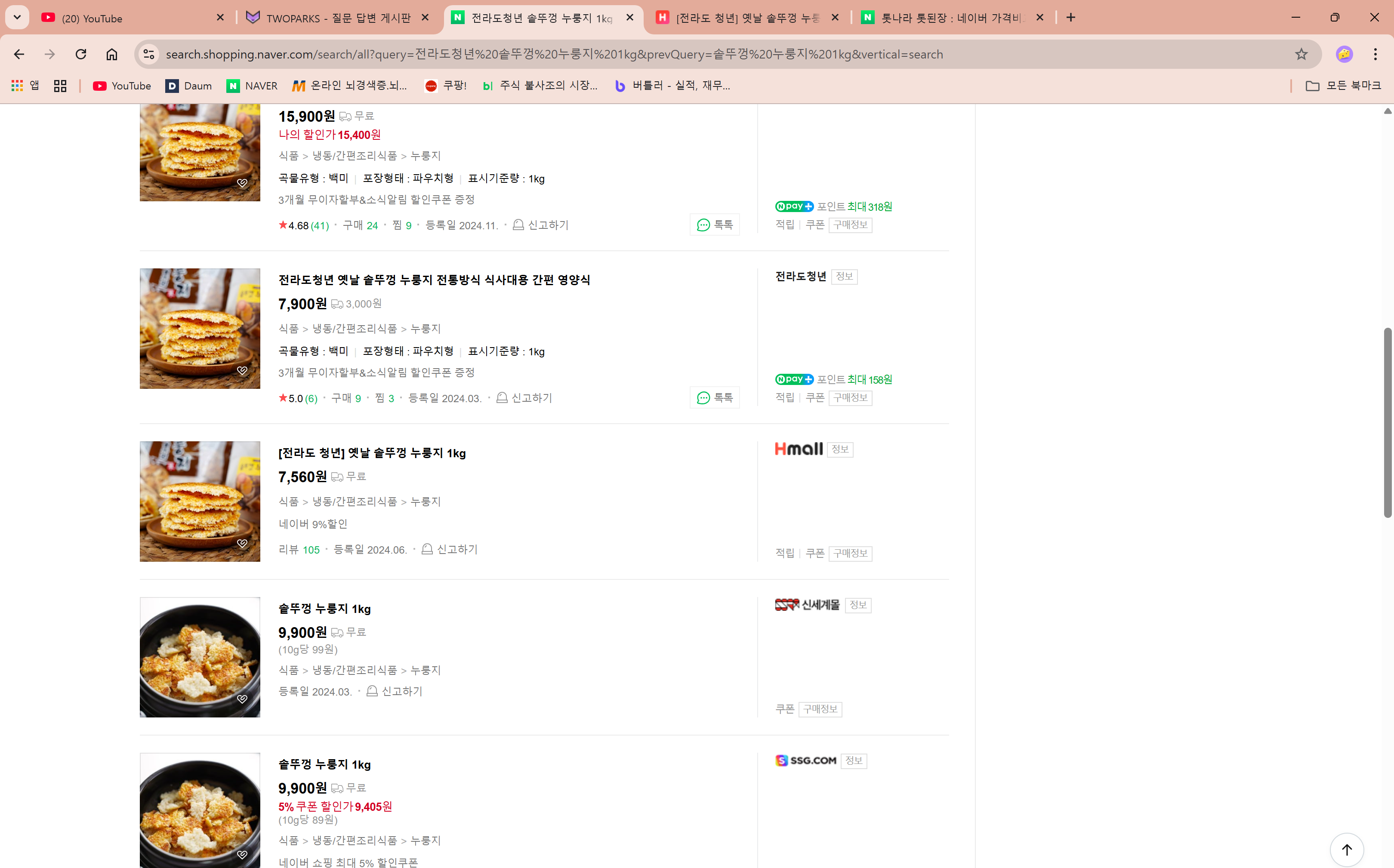 전라도청년 솥뚜껑 누룽지 1kg 투팍스몰 8,900원 무료배송 네이버 Hmall 7,560원 무료배송